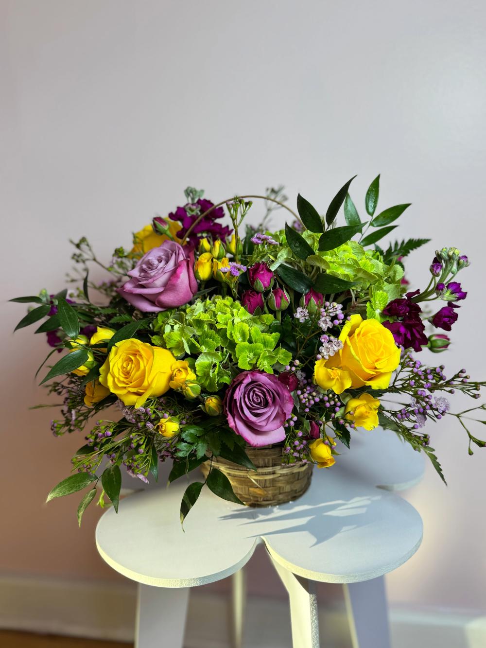 Product Description A delightful basket of rich yellows, purples and greens. Only the best for the best!